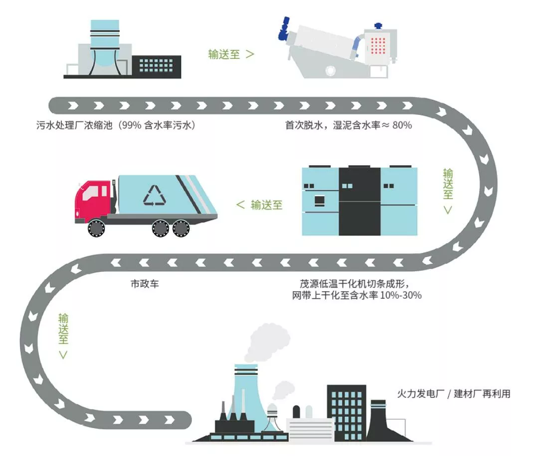 揚州茂源環保研發的污泥低溫干化設備,可直接將污水或含水率83%的污泥干化至含水率10%-30%干泥,減量可高達90%,有效殺菌高達90%,低能耗、無污染,廣泛應用于市政污泥和工業污泥(印染、造紙、電鍍、化工、皮革、制藥等)干化減量,10%-30%含水率的干泥后期可進行氣化、摻燒、堆肥或建材原料等無害資源化處置。