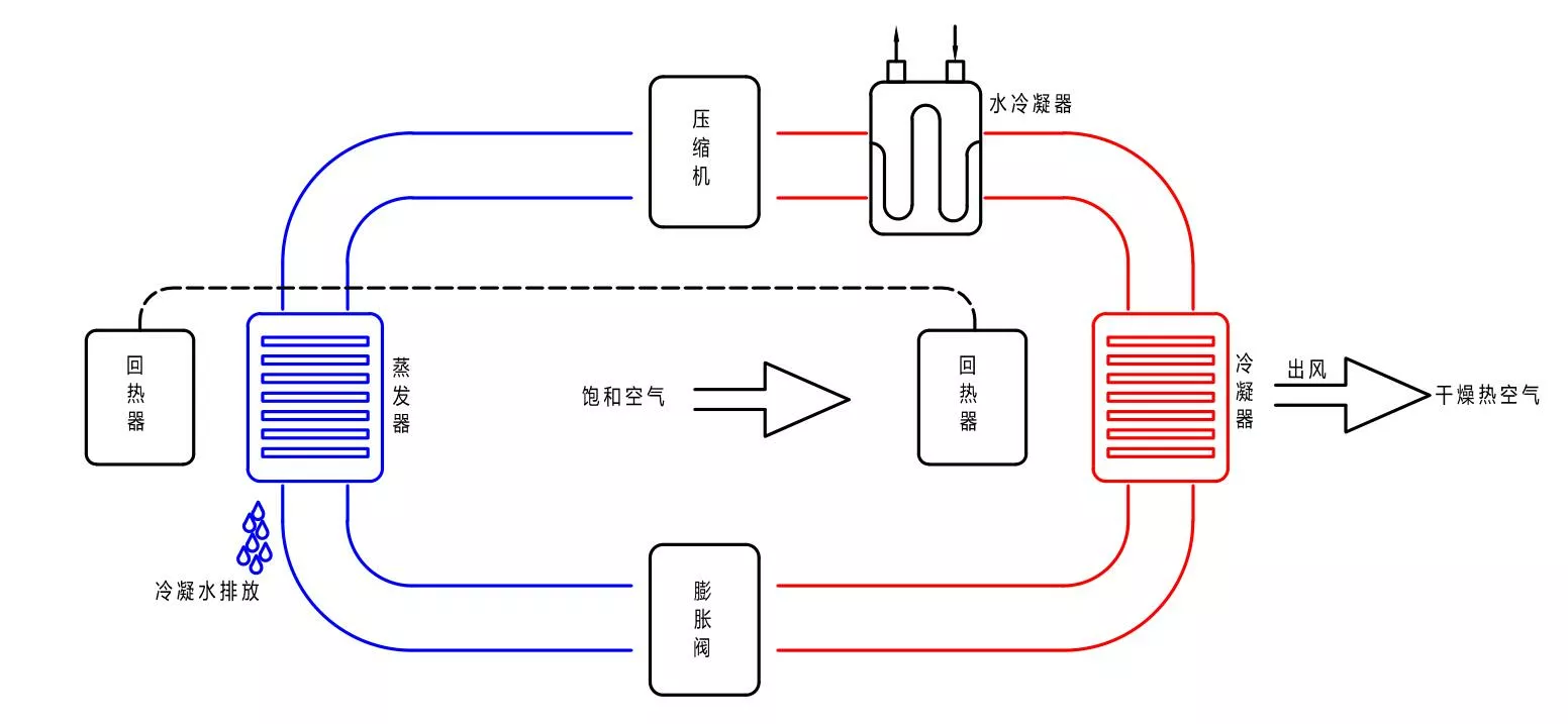 利用制冷系統將來自干燥室的濕空氣降溫脫濕,同時回收水分凝結的潛熱再次加熱干燥空氣,它是除濕(去濕干燥)與熱泵(能量回收)的結合,是干燥過程中能量的循環利用。