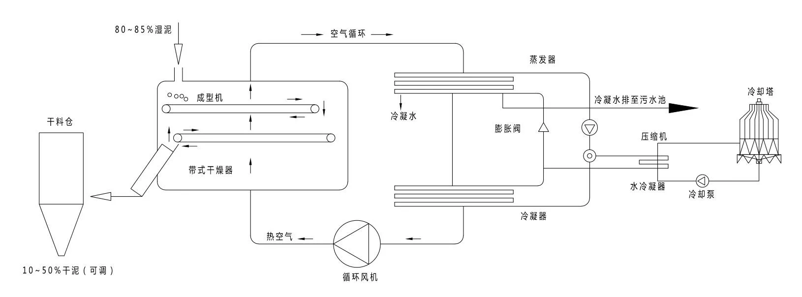 茂源能源自主創新研發的污泥低溫干化設備,是利用低溫熱泵除濕原理,采用對流熱風干燥的方式對網帶上的濕料污泥進行脫水干化減量,整套系統全密閉式設計,干燥熱風無熱損。