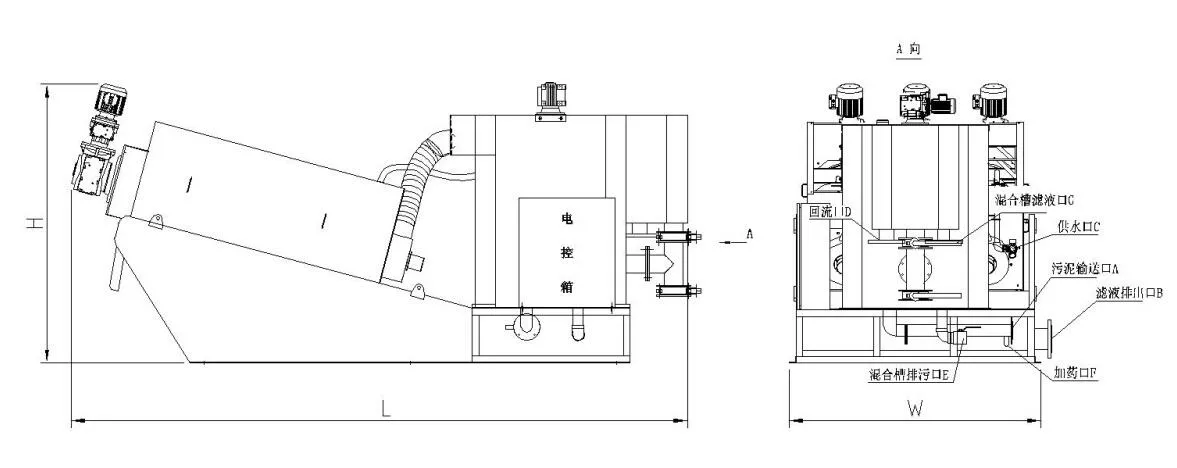 混合系統主要用于將污泥與藥劑在濃縮箱內進行充分混合,污泥絮凝抱團,同時水從濃縮系統中靠重力過濾一部分,形成礬花的污泥進行入到疊螺主體進行壓榨脫水。在混合槽設有進泥口、溢流口、加藥口和放空口,并設有液位調節裝置,從而可以調節污泥的進給量。
