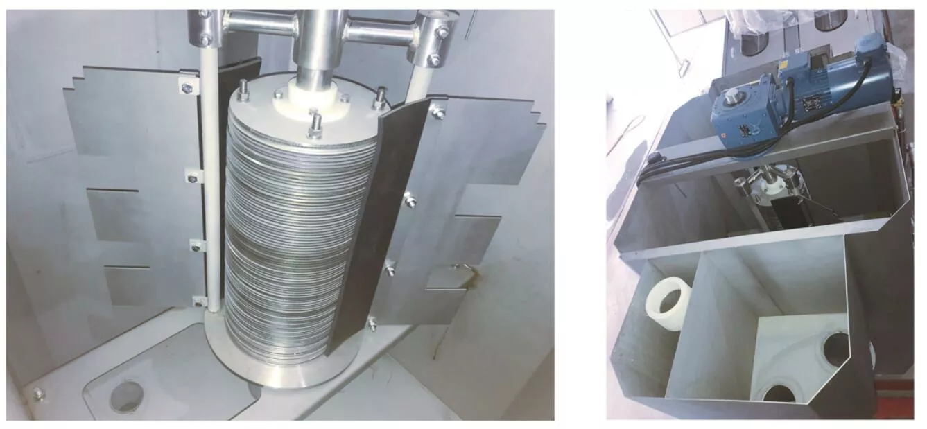 疊螺污泥脫水機的脫水主體是由多重固定環和游動環構成,螺旋軸貫穿其中形成的過濾裝置。前段為濃縮部,后段為脫水部,將污泥的濃縮和壓榨脫水工作在一筒內完成,以獨特微妙的濾體模式取代了傳統的濾布和離心的過濾方式。